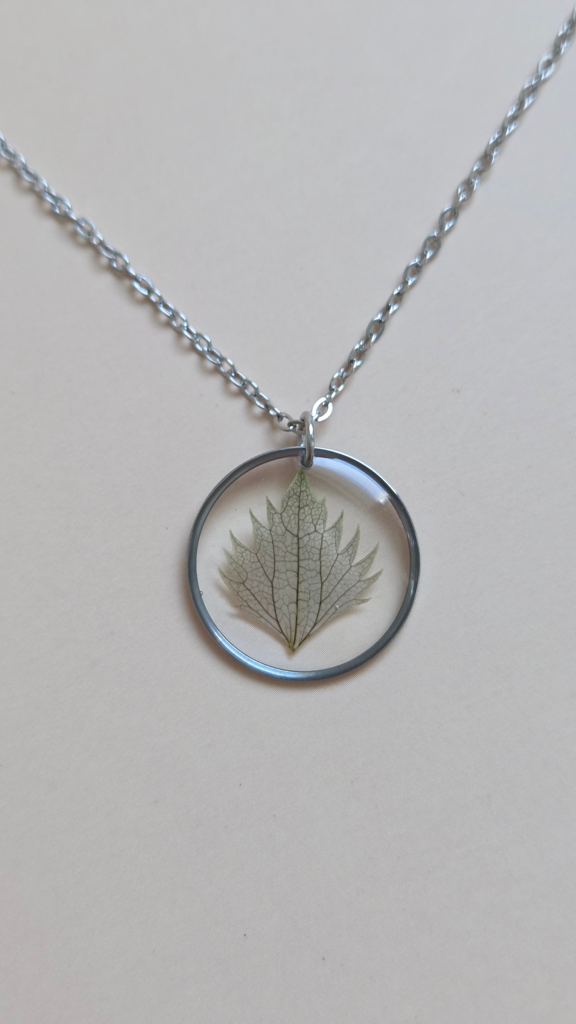 Necklace with a leaf in a round pendant, hand-cast with resin. I picked the leaf, dried it, and lovingly handcrafted it into this beautiful pendant.