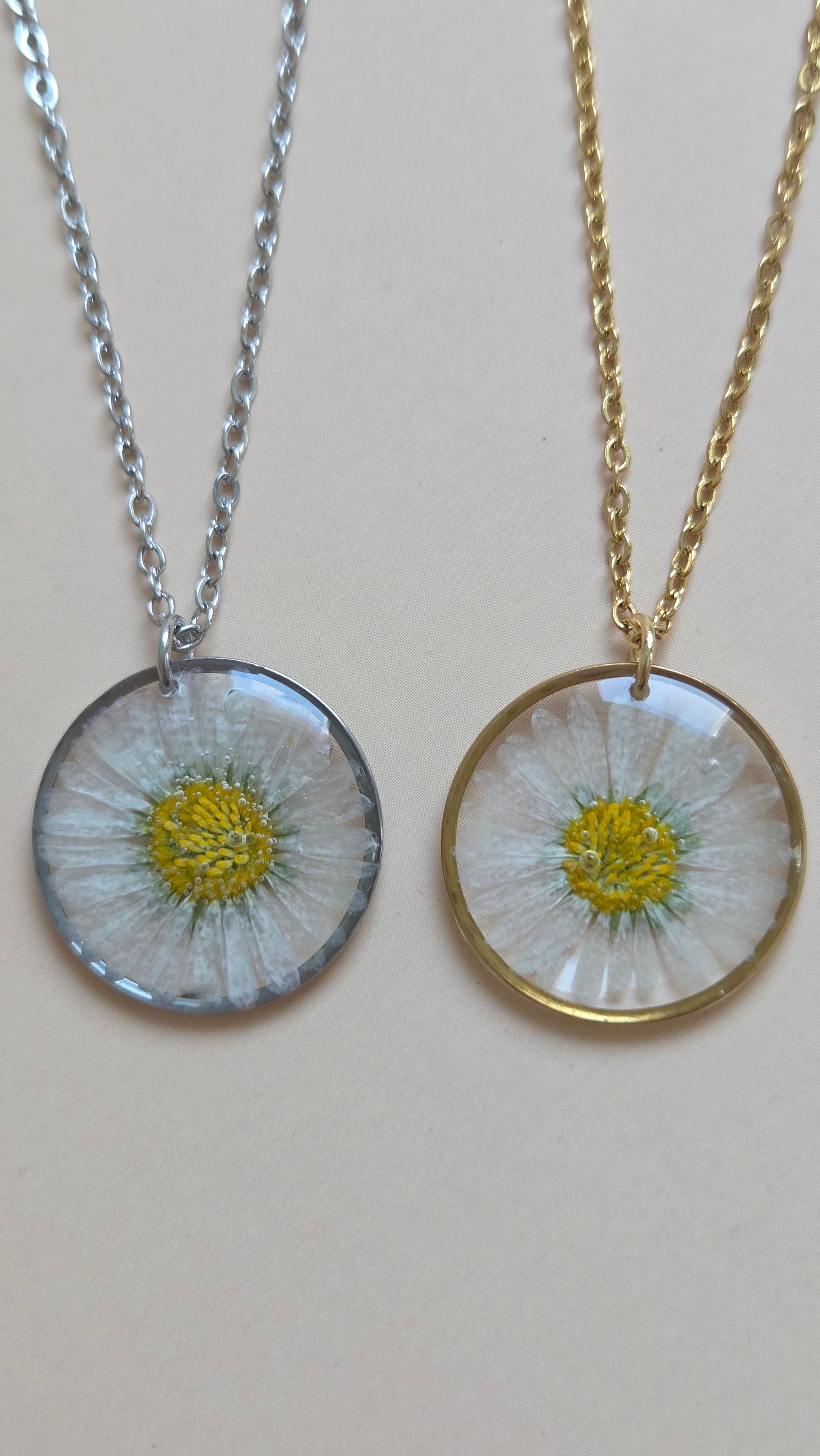 Necklace with a daisy in a round pendant, hand-cast with resin. I picked the flower, dried it, and lovingly handcrafted it into this beautiful pendant.