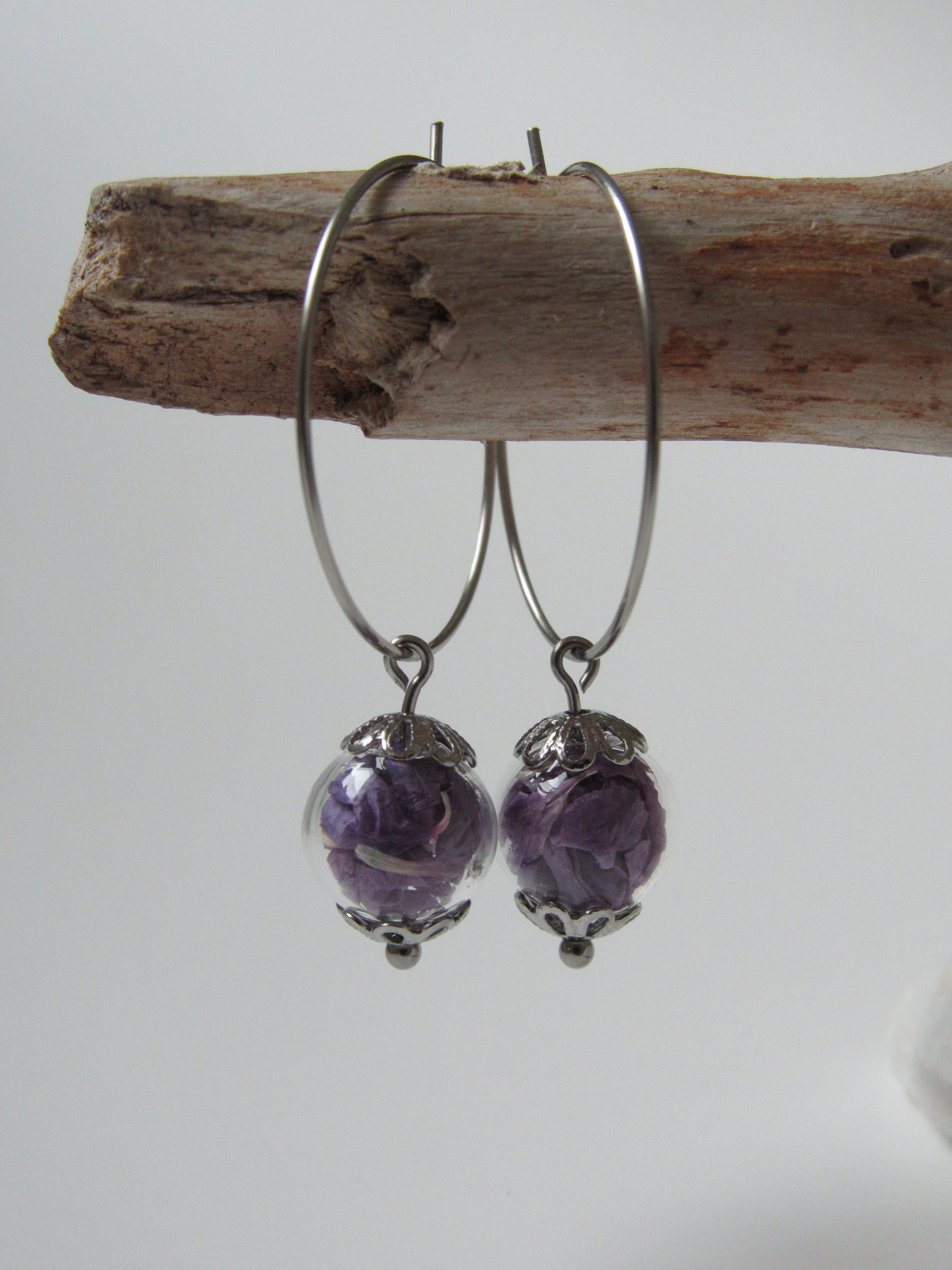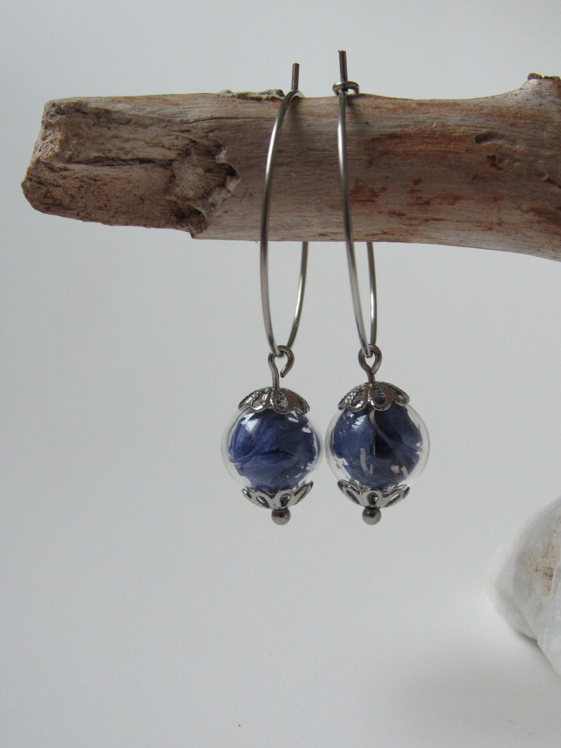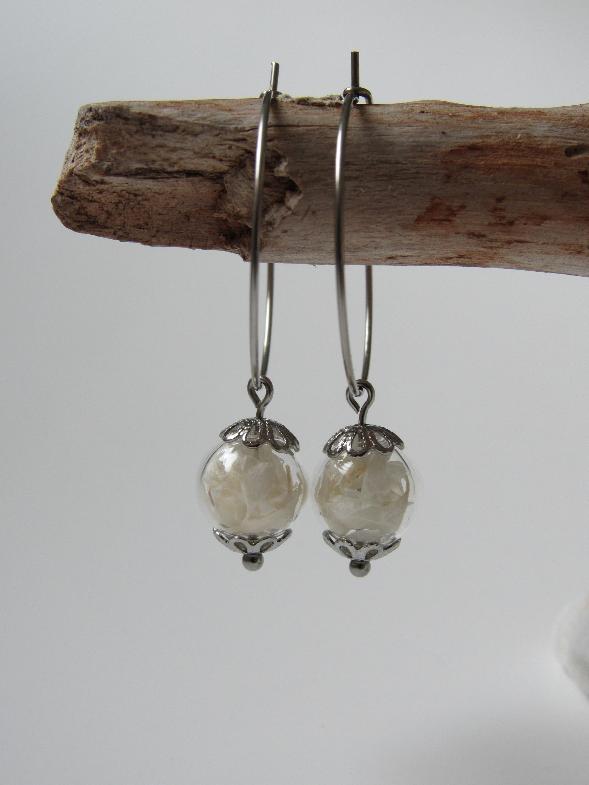 Creolen mit Glaskugel in der getrocknete Blüten enthalten sind.