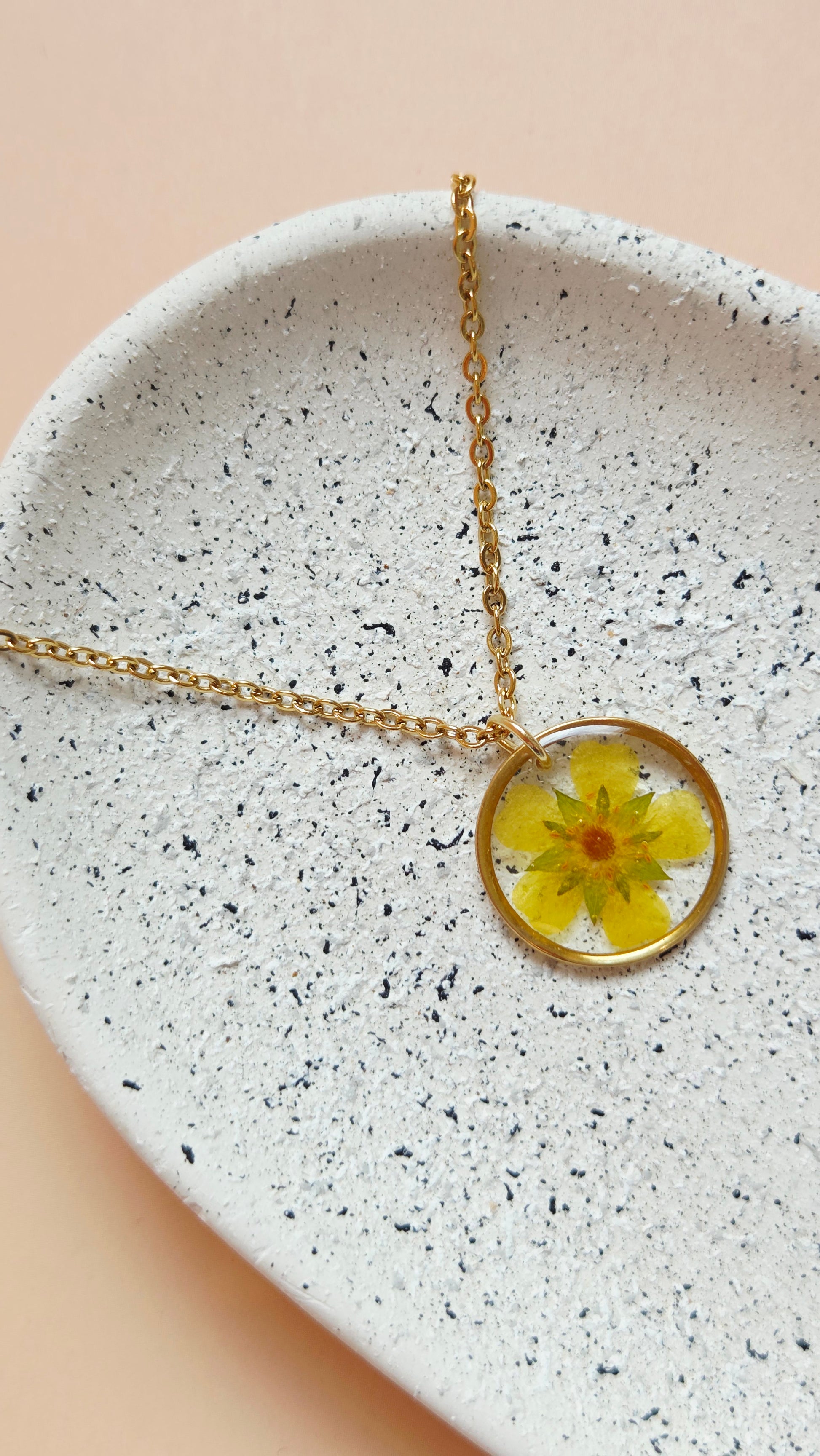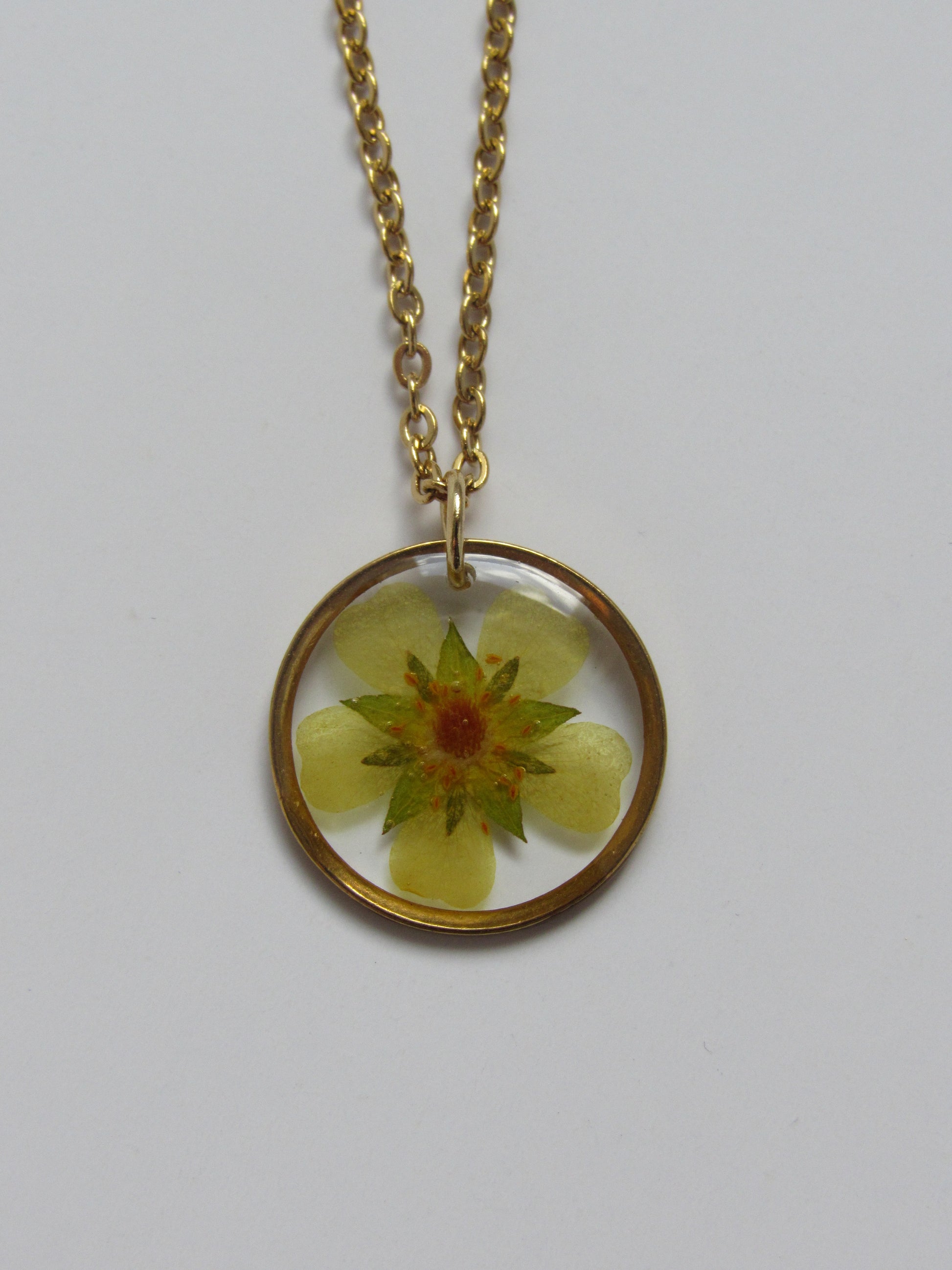 Halskette mit Blume der Indischen Scheinerdbeere in runden Anhänger handgegossen mit Harz. Die Blume wurde von mir gepflückt, getrocknet und in liebevoller Handarbeit in diesen wunderschönen Kettenanhänger verewigt.