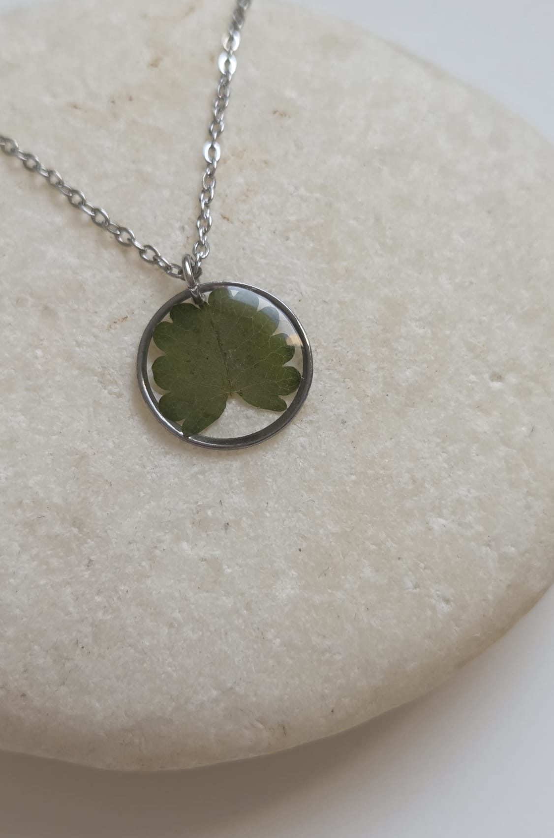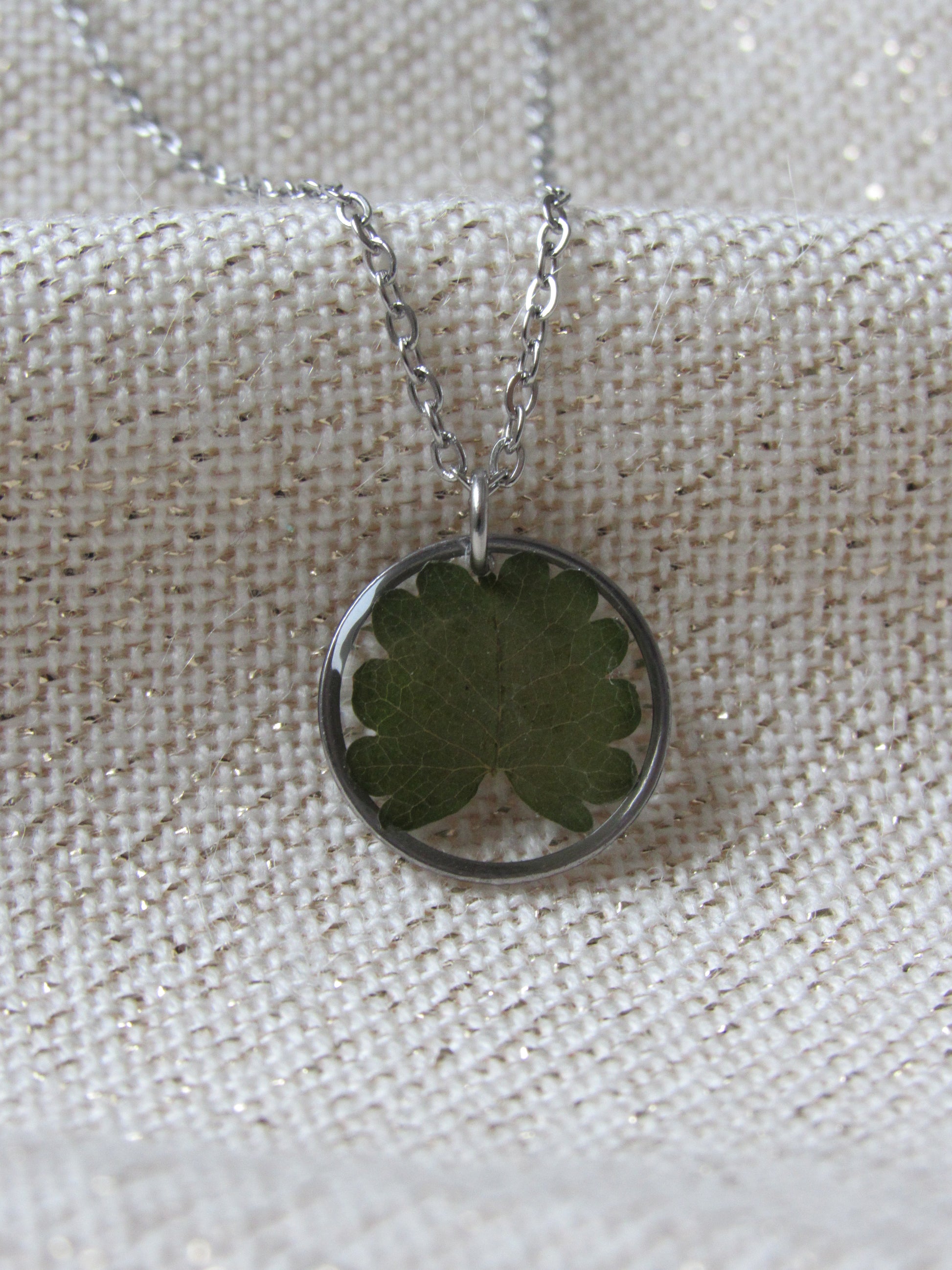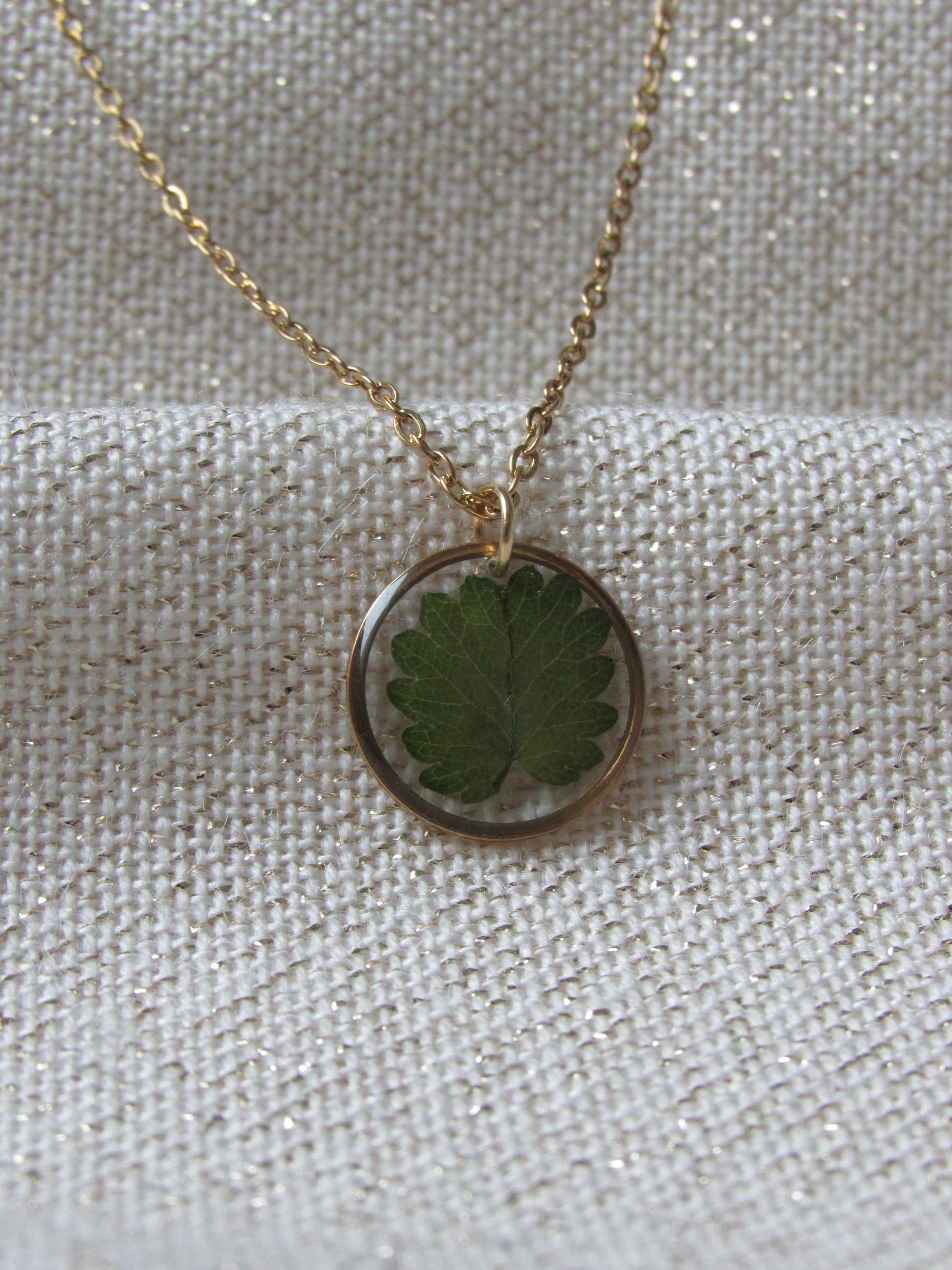 Halskette mit Blatt in runden Anhänger handgegossen mit Harz. Das Blatt wurde von mir gepflückt, getrocknet und in liebevoller Handarbeit in diesen wunderschönen Kettenanhänger verewigt.