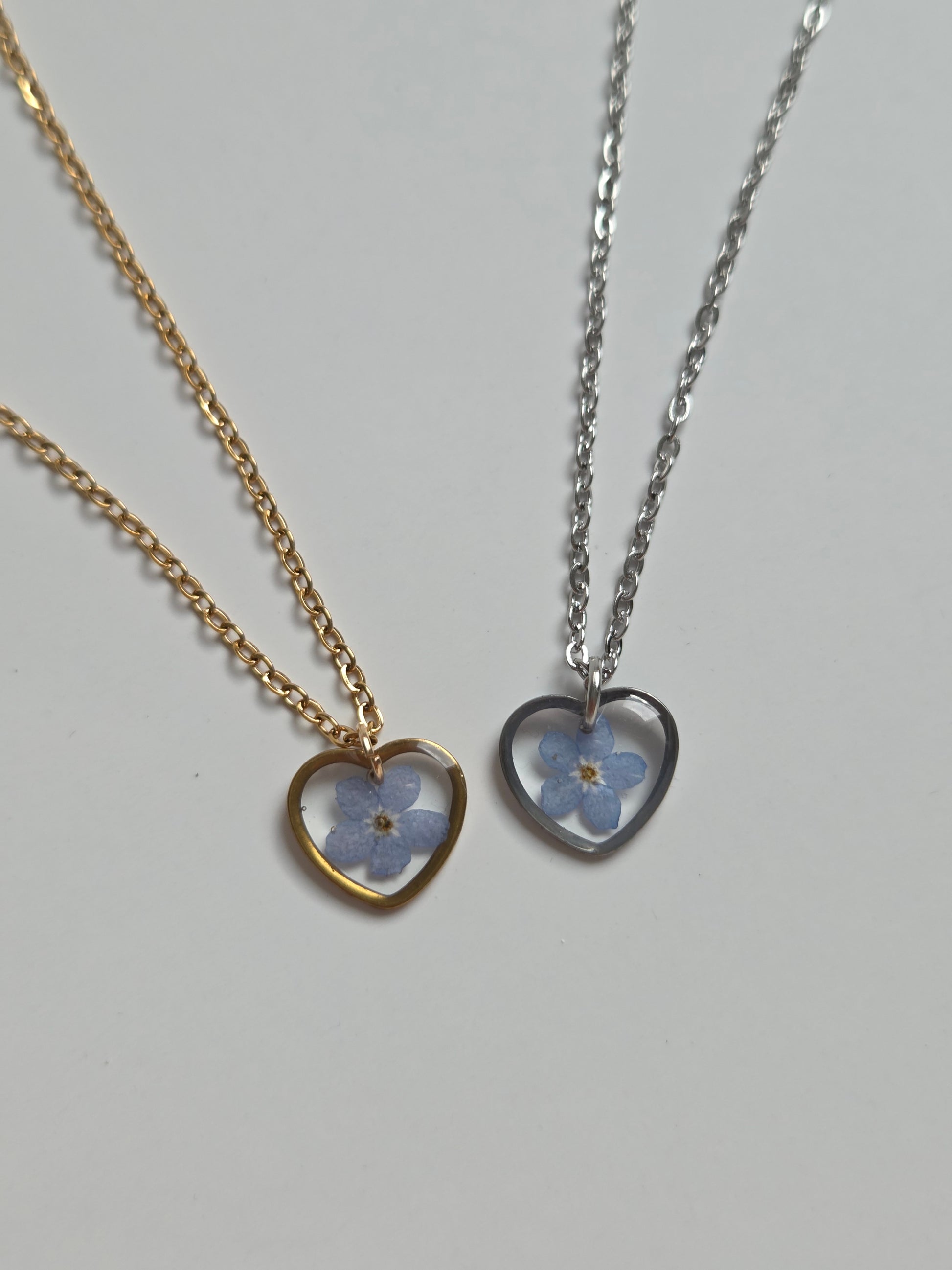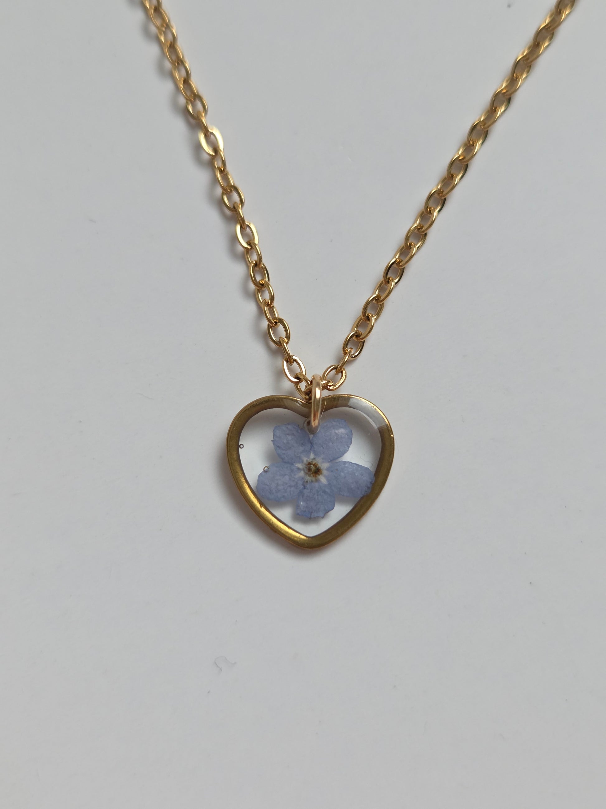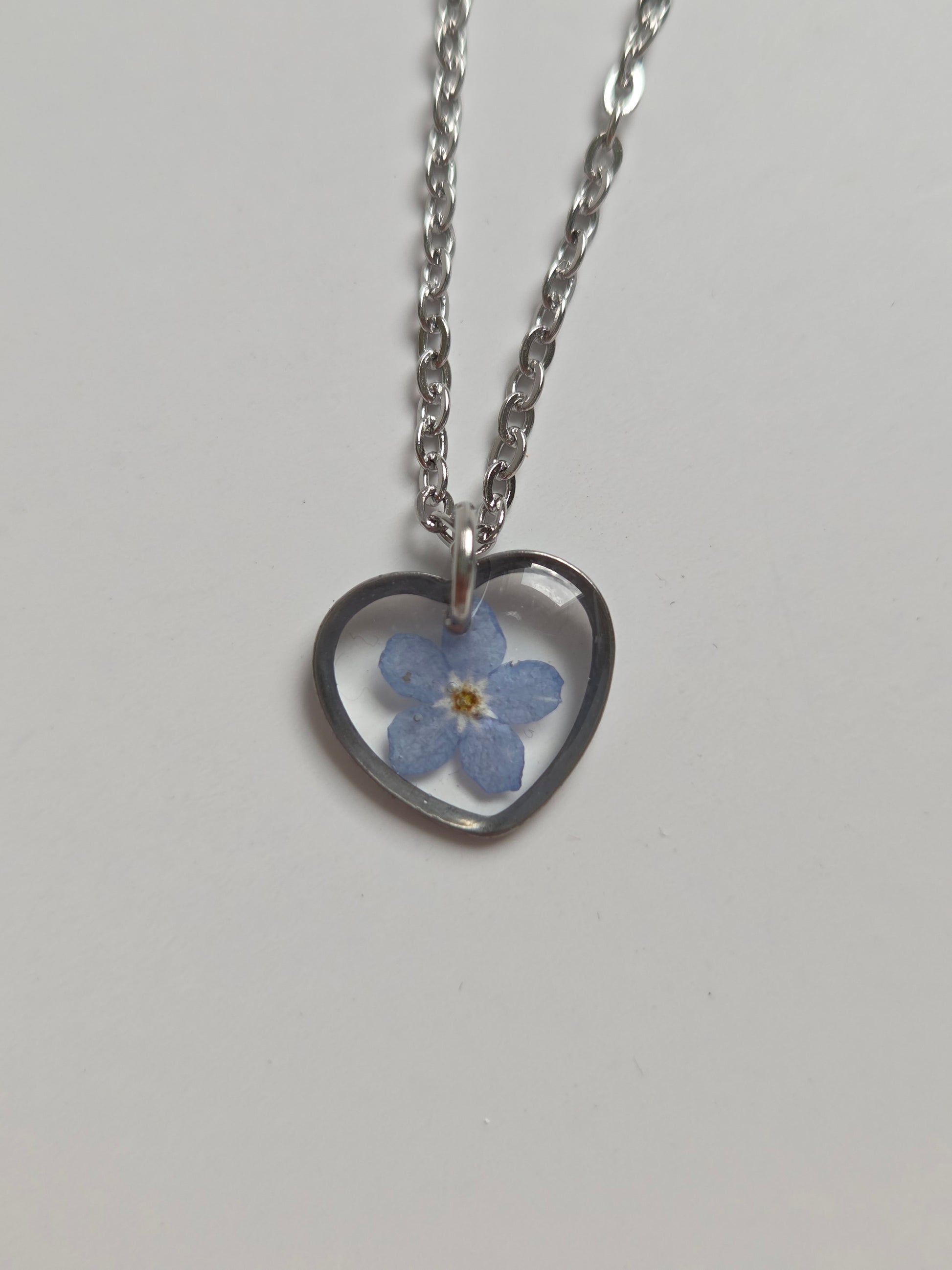 Halskette mit Vergissmeinnicht in herzförmigen Anhänger handgegossen mit Harz. Die Blume wurde von mir gepflückt, getrocknet und in liebevoller Handarbeit in diesen wunderschönen Kettenanhänger verewigt.