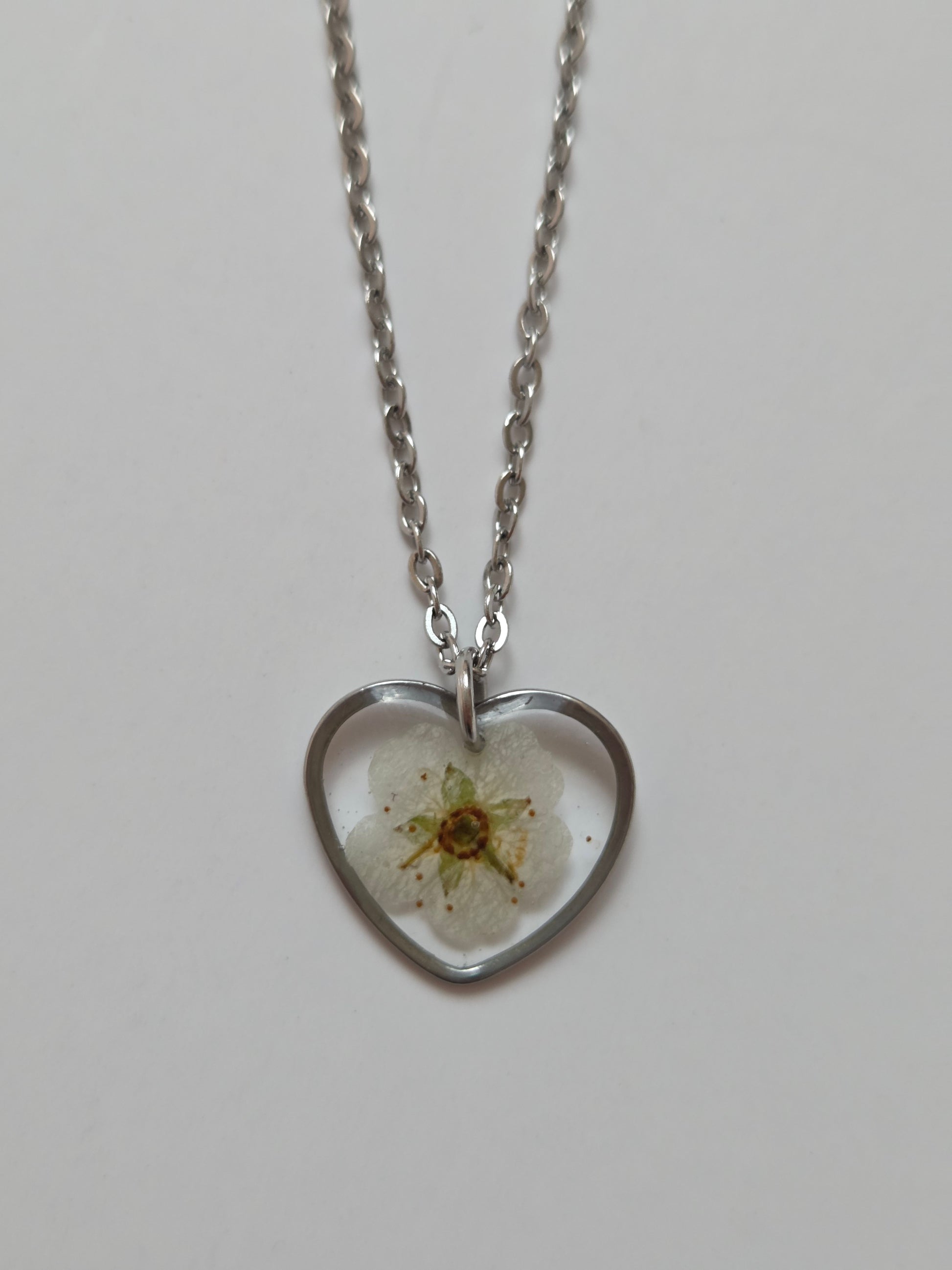 Halskette mit weißer Blume in herzförmigen Anhänger handgegossen mit Harz. Die Blume wurde von mir gepflückt, getrocknet und in liebevoller Handarbeit in diesen wunderschönen Kettenanhänger verewigt.