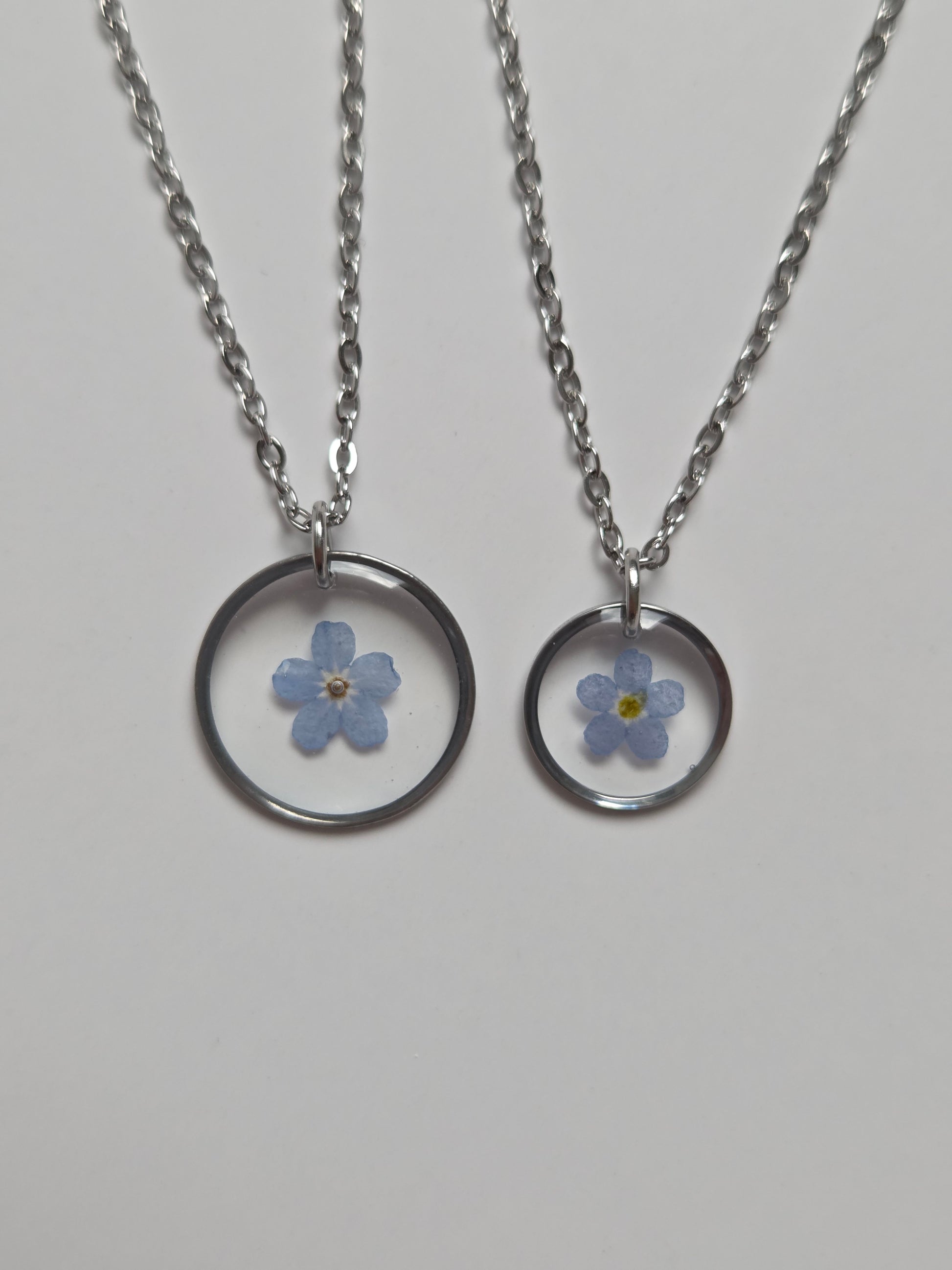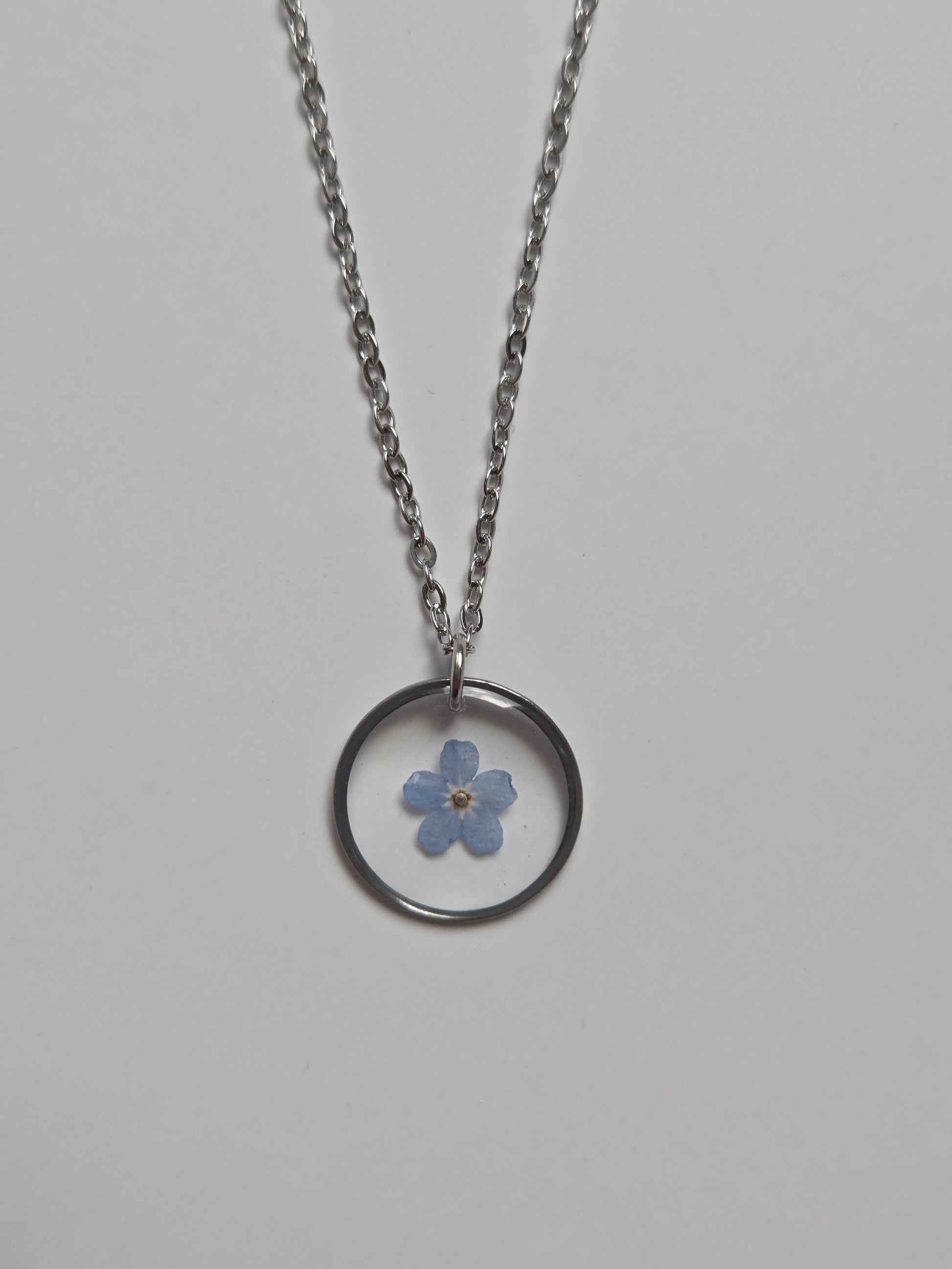 Halskette mit Vergissmeinnicht in runden Anhänger handgegossen mit Harz. Die Blume wurde von mir gepflückt, getrocknet und in liebevoller Handarbeit in diesen wunderschönen Kettenanhänger verewigt.