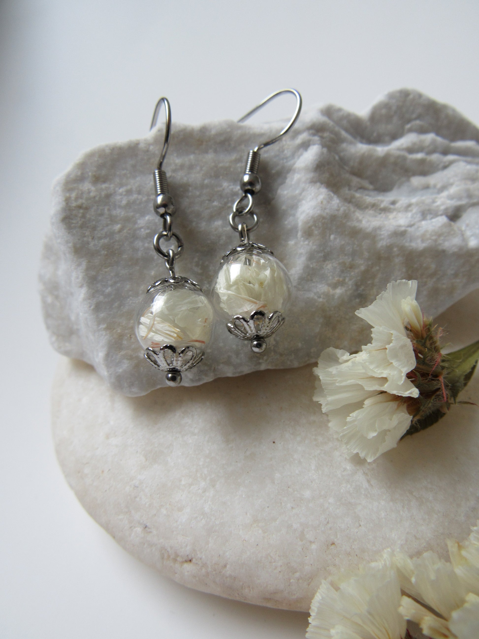 Hängeohrringe Fischerhaken mit Glaskugel in der getrocknete Blüten enthalten sind.