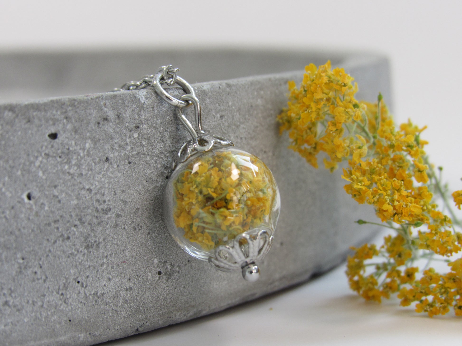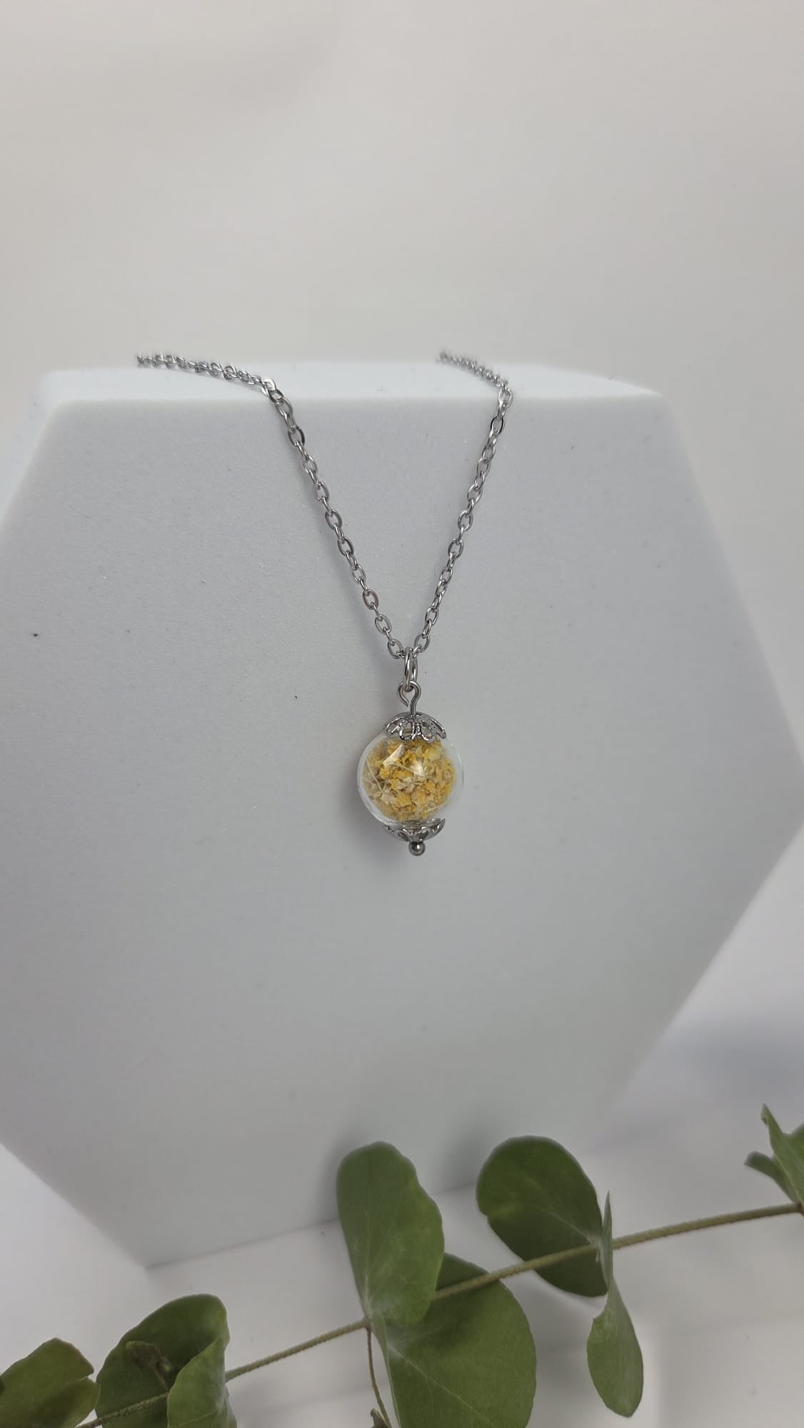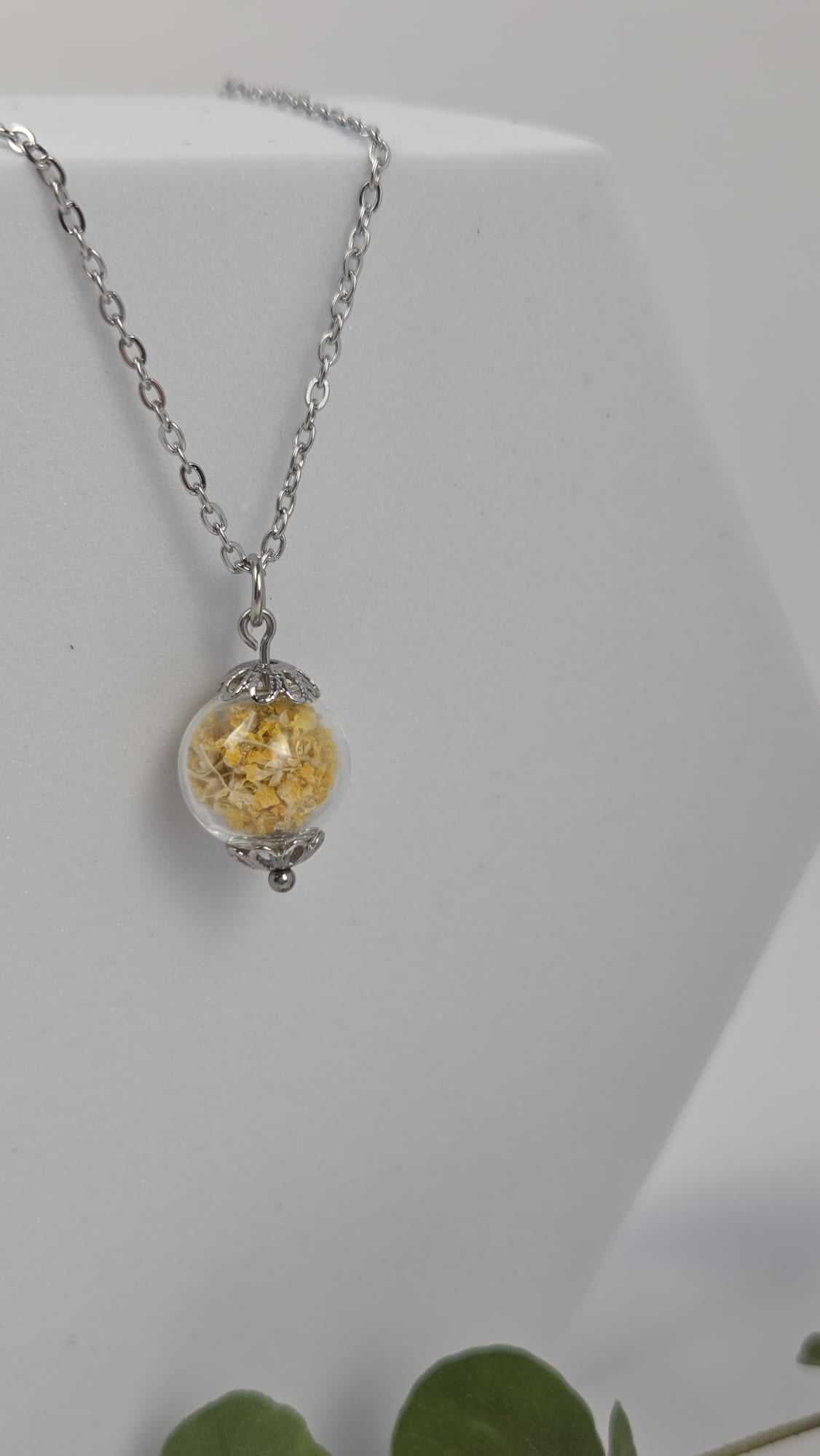 Halskette mit Glaskugel in der getrocknete Blüten enthalten sind.