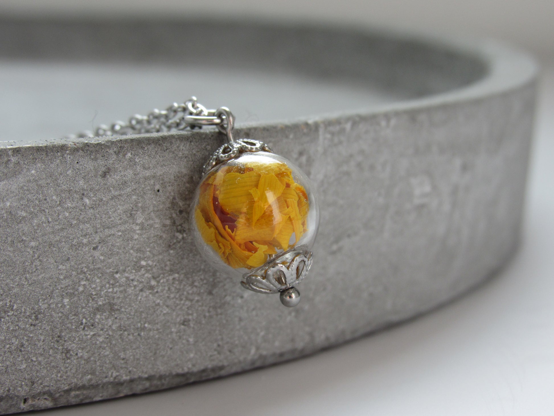 Halskette mit Glaskugel in der getrocknete Blüten enthalten sind.