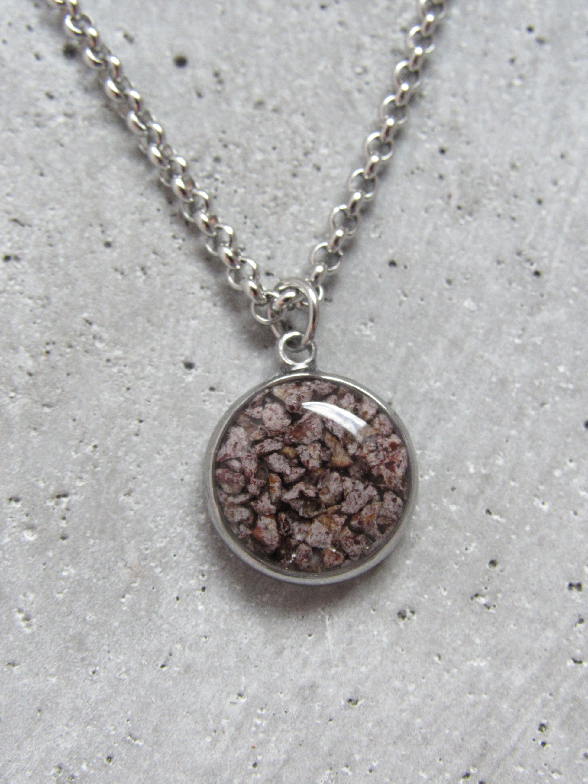 Halskette mit Steinen in runden Anhänger handgegossen mit Harz.
