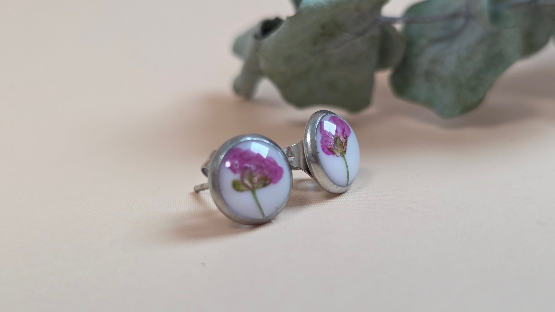Kleine nette Ohrstecker mit Blume handgegossen in Harz. Die Blume wurde von mir gepflückt, getrocknet und in liebevoller Handarbeit in diesen wunderschönen Schmuckstück verewigt.
